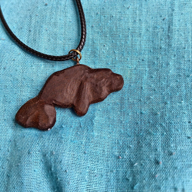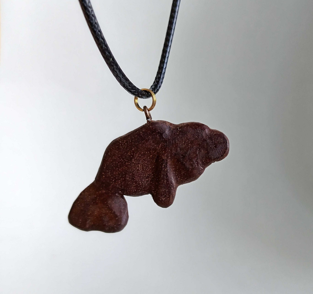 Laissez-vous séduire par l’authenticité et la chaleur de ce pendentif sculpté en forme de lamantin, pièce unique.