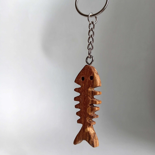 Poisson tout nu découpé dans du bois d'olivier, prêt à transporter vos clés avec classe et humour.